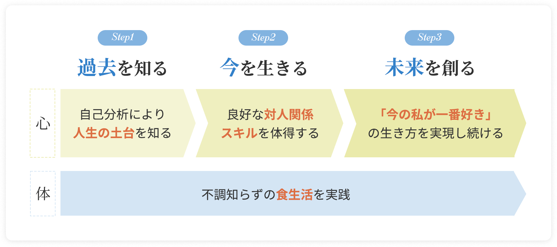 心と体を健全に整えていくことで、ごきげん体質にリセットし、「これで大丈夫!」と心から思える自信を手に入れていきます。
