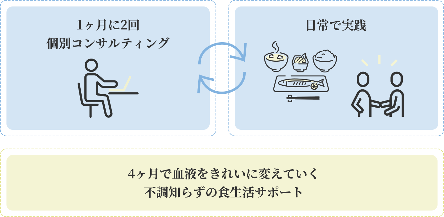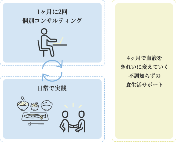 あなたが今食べているものを基にして、積極的に摂り入れるもの・避けるべきものについてのサポートしていきます。「足し算」と「引き算」が明確になることで、4ヶ月で血液がきれいに変わる「食生活」を定着させていきましょう!